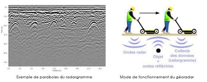 Le géoradar permet de vérifier et de compléter les résultats de la radio-détection; notamment sur les réseaux dits passifs tel que les conduites en P.V.C., P.E.H.D, béton, grés, P.R.V, et amiante-ciment.
