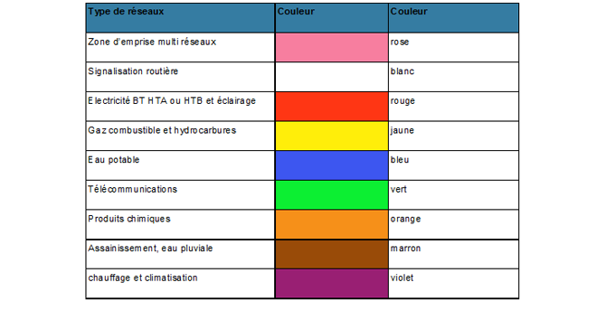 -Ouverture des regards, marquage au sol des directions des canalisations aux couleurs conventionnelles (cf. tableau ci dessous) et indication des profondeurs.